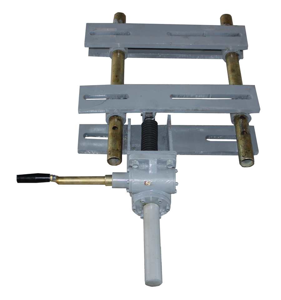 摘要:一種電機皮帶松緊度調(diào)整器,構(gòu)成中包括底座,電機座,平移驅(qū)動裝置;所述底座兩側(cè)平行設置滑杠,所述電機座通過托架支撐在滑杠上,所述平移驅(qū)動裝置固定在底座一側(cè),所述平移驅(qū)動裝置的動力輸出端與電機座一側(cè)連接,可帶動電機座作直線位移運動;在電機座上設有電機固定孔.本實用新型采用平衡位移原理,配裝蝸輪,蝸桿,絲杠傳動系統(tǒng),使電動機產(chǎn)生平行左右移動,達到抽油機換帶和緊帶方便快捷的目的.采用搖臂輸入軸驅(qū)動絲杠,松緊皮帶或拆裝皮帶只需一個人即可操作,不用松動任何螺栓.具有較好的通用性,可根據(jù)需要調(diào)整滑杠長短,適合不同型號的電機使用,結(jié)構(gòu)簡單,安裝方便,經(jīng)濟實用.