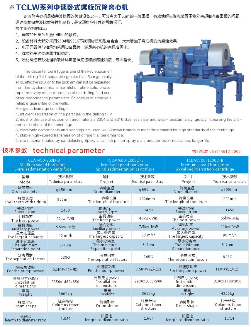 TCLW系列中速臥式螺旋沉降離心機是鉆井液處理的關鍵設備之一,可分離大于5um的固相,有效地解決旋流裝置不能分離超細有害固相的問題,迅速恢復鉆井液比重等性能參數(shù).是實現(xiàn)科學打井的可靠保證。