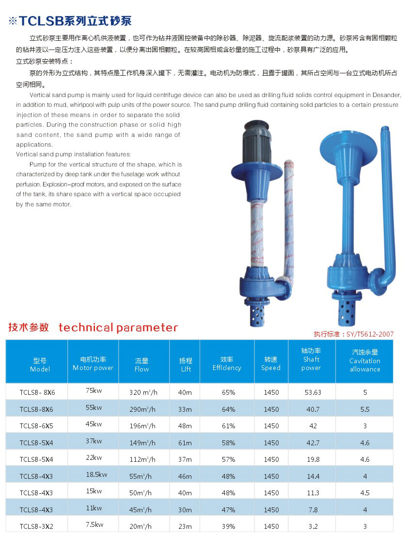 TCLSB系列立式砂泵主要用作離心機供液裝置,也稱作立式供液泵可作為鉆井液固控裝備中的除砂器、除泥器、旋流配漿裝置的動力源。砂泵將含有固相顆粒的鉆井液以一定壓力注入這些裝置,以便分離出固相顆粒。在較高固相或含砂量的施工過程中,砂泵具有廣泛的應用。